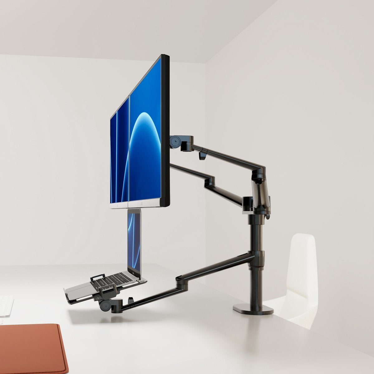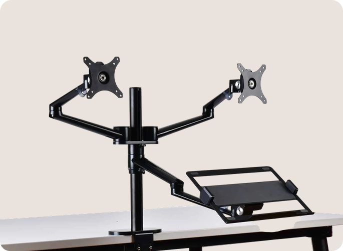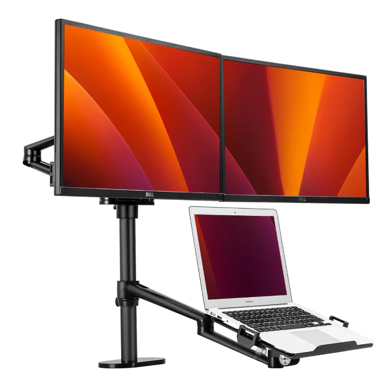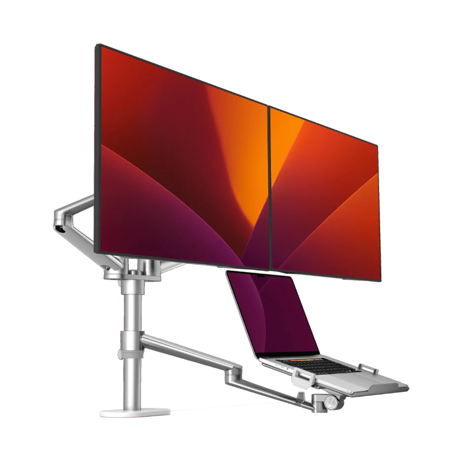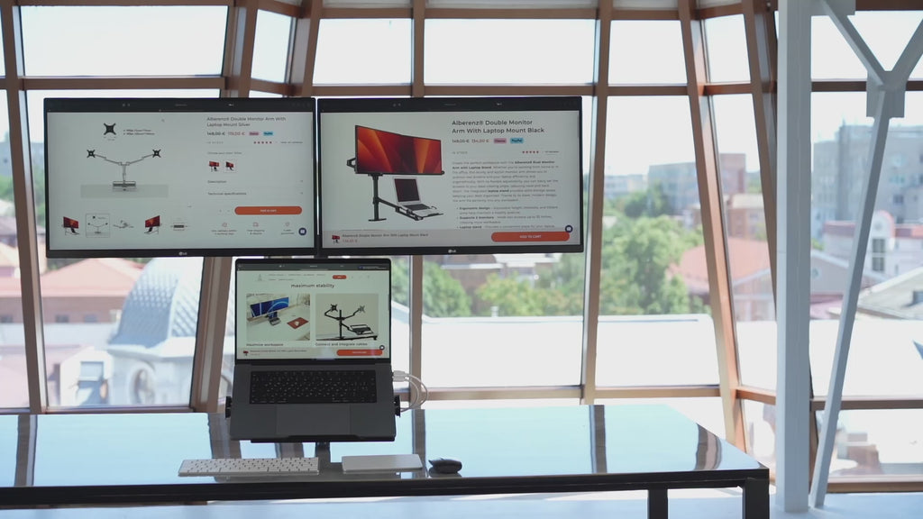 Upgrade je werkplek met de Alberenz® Dubbele Monitorarm met Laptopstandaard en ervaar de ultieme combinatie van functionaliteit en design voor meer productiviteit en comfort.