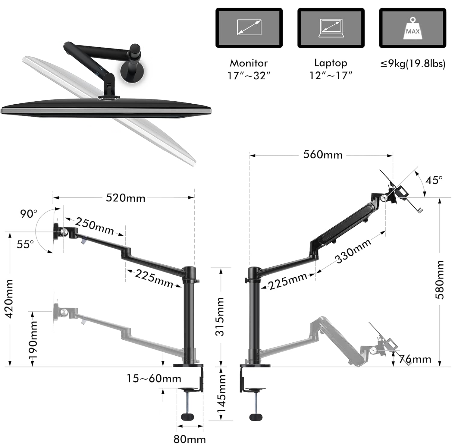 - Ergonomisch ontwerp – Verstelbare hoogte, draaibare en kantelbare armen helpen je een gezonde werkhouding te behouden.