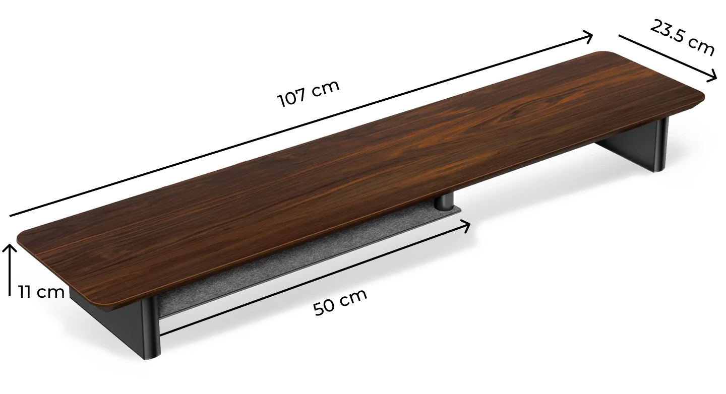 Met een royale breedte van 107 cm is er makkelijk plek voor twee monitoren tot 27” of één ultrawide monitor tot 49”. De open ruimte eronder is ideaal om je toetsenbord en muis op te bergen, zodat je bureau netjes en opgeruimd blijft. Dankzij de stevige, duurzame constructie kan hij tot 30 kg dragen, perfect voor zware monitoren of meerdere apparaten. De luxe walnoot afwerking geeft je werkplek een warme, premium uitstraling, waardoor werken niet alleen comfortabeler maar ook stijlvoller wordt.