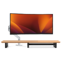 Massief walnoothouten verhoger gecombineerd met een heavy-duty gasveer monitorarm voor langdurige prestaties.